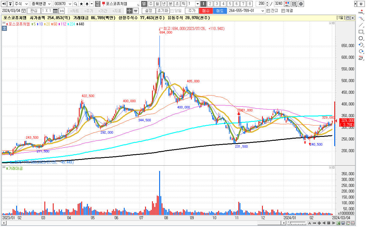 ▶ 포스코케미칼에서 2024년 2월 24일 포스코퓨처엠으로 사명을 변경하였다. 포스코퓨처엠은 국내 유일 흑연계 음극재를 다루는 기업이다. 포스코퓨처엠은 에너지 소재사업의 차별적 기술력 확보 및 글로벌 공급망을 구축하고, 사업 다각화를 통해 창사이래 최대실적을 2022년에 달성하였습니다. 2023년 3월부터 2차전지 관련 기업들의 재평가에 편승하여 엄청난 주가 상승률을 보여주었습니다.