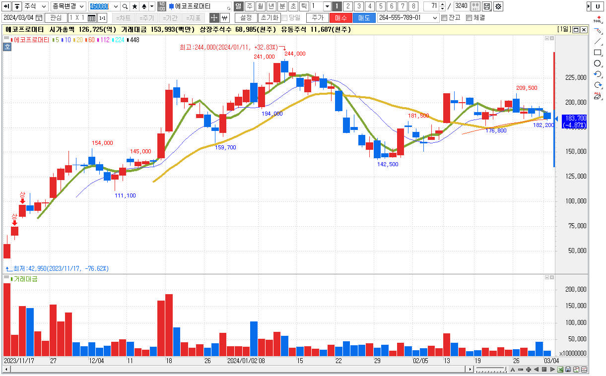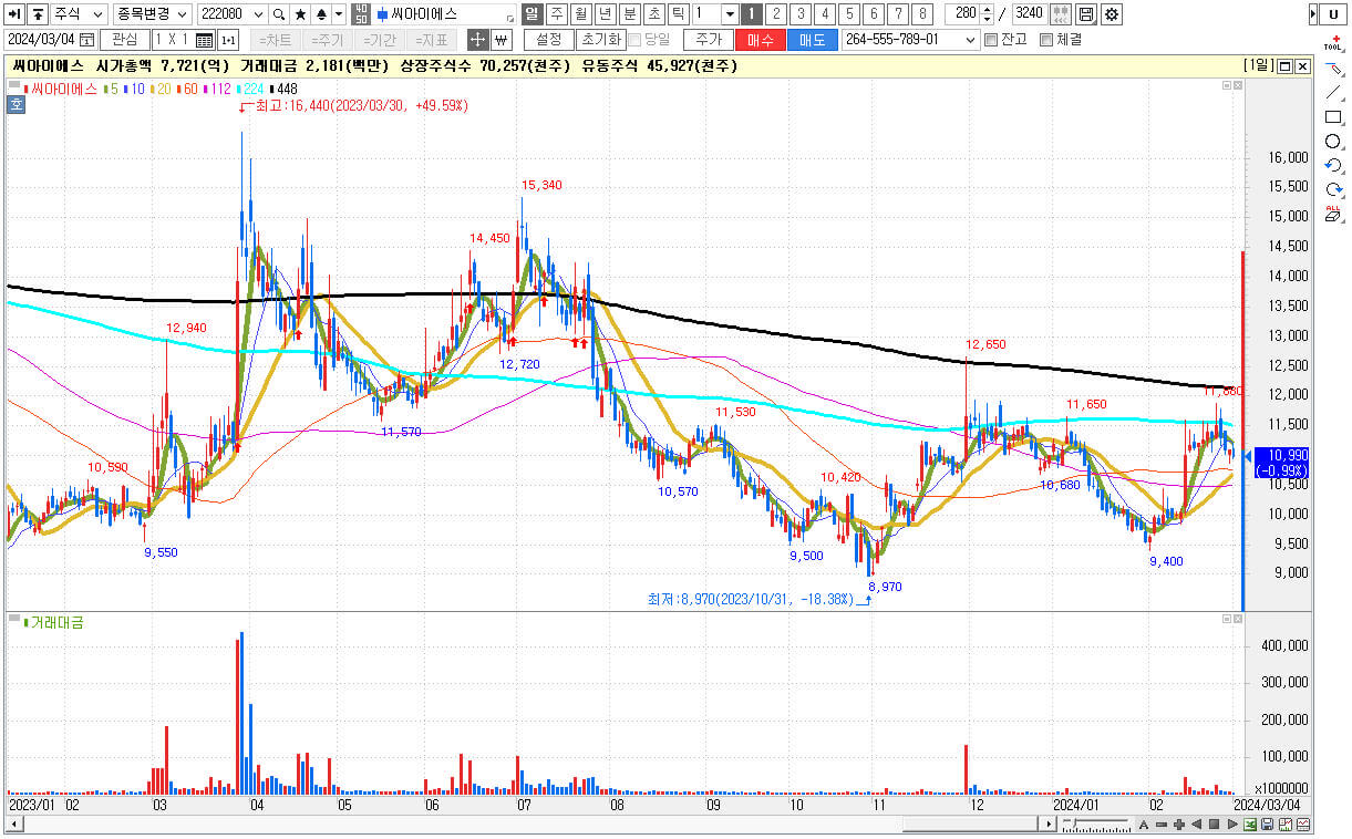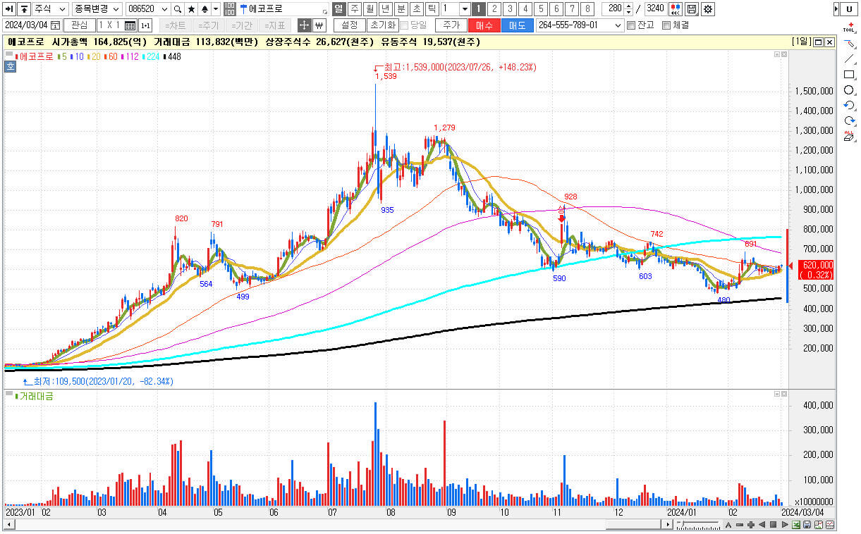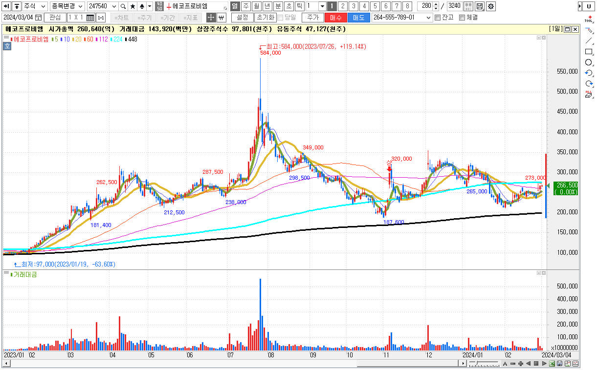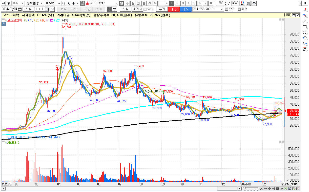 ▶ 2023년 4월 10일 10시경 2차전지 고용량 실리콘계 음극용 바인더 사용화... 고객사와 성능 확인 중이라는 기사 한 줄로 당시 2차전지 관련주 중 대장을 먹었다. 원래는 생활화학 사업부문과 바이오 에너지 부문을 영위 중이던 기업이었다. 비누, 샴푸를 만드는 회사에서 2차전지 관련주로 기업가치가 몇단계 껑충 뛰었다.