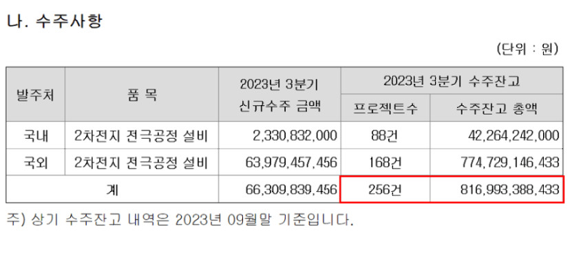 ▶ 대표적인 2차전지 관련주로 2차전지 전극공정 설비를 국내외에서 매출이 발생 중이다. 2023년 9월 말 기준 256건, 8,170억 규모의 수주잔고내역이 있다. 높은 선수금 탓에 부채가 자꾸 늘어나지만 세상에서 가장 행복한 부채가 아닐까싶다.